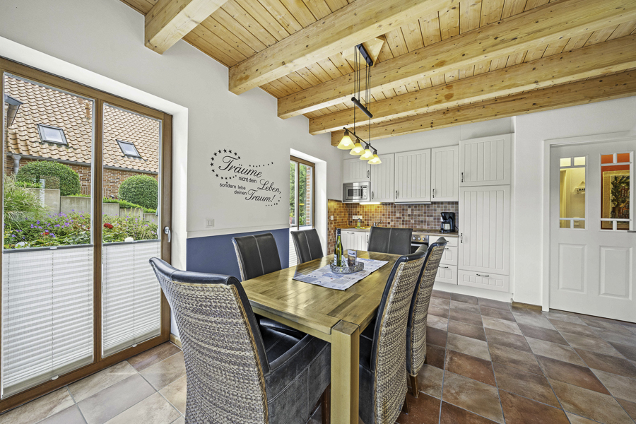 Zum Ortskern sind es keine 5 Gehminuten.Im Erdgeschoss des Hauses befindet sich das Wohn-/ Esszimmer mit moderner Einbauküche (mit Geschirrspül- maschine, Mikrowellenherd, Backofen, Kaffeemaschine, etc.), ein Schlafzimmer mit Doppelbett und ein behindertengerechtes Duschbad. Der helle Wohnbereich ist mit LCD-TV und Stereoanlage ausgestattet.Im Obergeschoss sind zwei weitere Schlafzimmer, eines mit einem Doppelbett, das andere mit zwei Einzelbetten und ein zweites WC mit Waschbecken eingerichtet. Zusätzlich lädt ein Wohn-/Sitzraum mit Aussicht auf den Deich zum Relaxen ein.Ein Garten mit Terrasse auf der Südseite und ein Pkw-Stellplatz sind vorhanden.Das Haus ist an Nichtraucher ohne Haustiere zu vermieten.