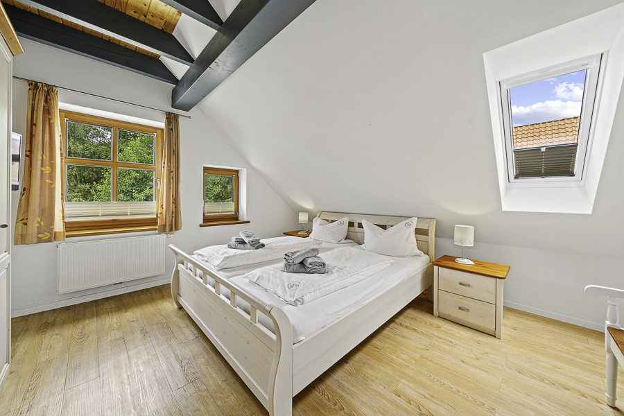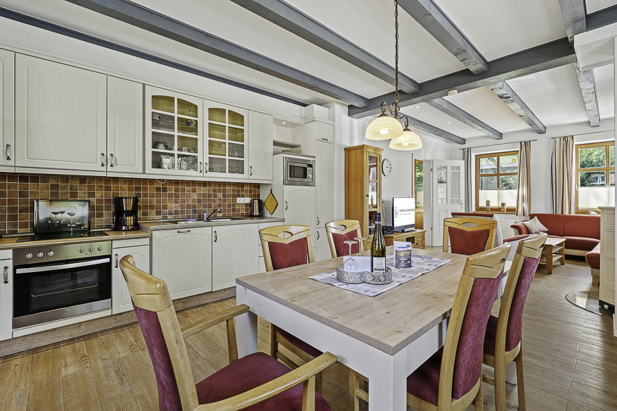 hat eine Wohnfläche von 90 m² und besteht aus einem großen Wohnzimmer mit Kamin, einer Essecke und moderner Einbauküche, zwei Schlafzimmern mit TV und zwei Badezimmern (Dusche und Badewanne).
